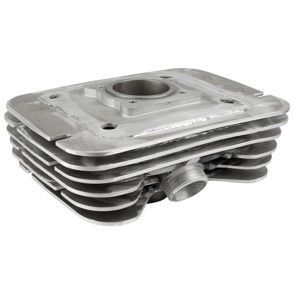 Hinweis: Da das Schweißen von Aluminium unter sehr hohen Temperaturen geschieht, kann es beim Anschweißen dieser Kühlrippen zu hohem Verzug des Zylinderkörpers und der Laufbuchse kommen. Wir empfehlen deshalb, den Zylinder im Anschluss schleifen zu lassen, um zu garantieren, dass die Zylinderbuchse wirklich zylindrisch ist und keine Schäden des Motors als Folge des Verzugs zustande kommen. Bei Aluminiumzylindern mit Nikasilbeschichtung ist das Anschweißen nur mit hohem Risiko verbunden, da diese nicht neu geschliffen werden können.