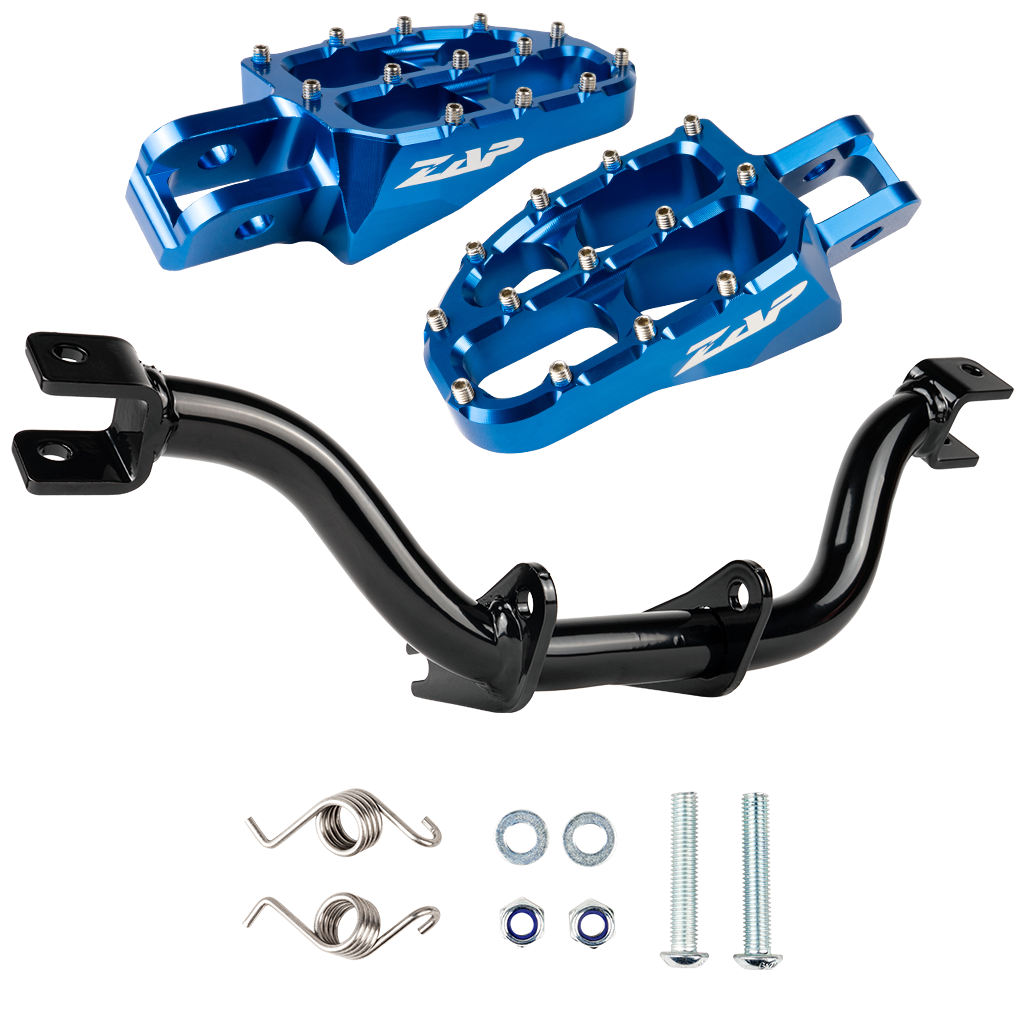 Fußrastenträger verstärkt (schwarz pulverbeschichtet) mit ZAP Fußrasten (blau eloxiert)