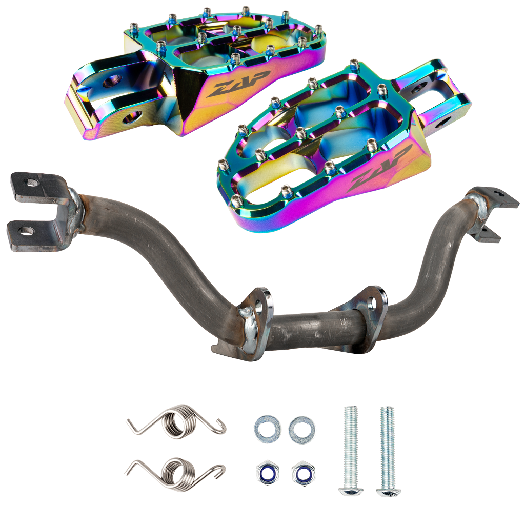Produktinformationen "Fußrastenträger verstärkt (unbeschichtet) mit ZAP Fußrasten (rainbow eloxiert)"